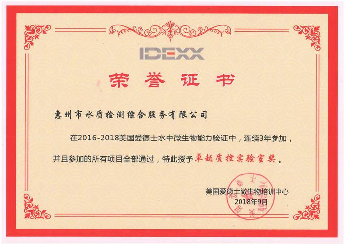 2016-2018年國(guó)標(biāo)4項(xiàng)水中微生物國(guó)際能力驗(yàn)證中表現(xiàn)卓越,被美國(guó)國(guó)愛(ài)德士微生物培訓(xùn)中心同時(shí)授予“卓越實(shí)驗(yàn)室獎(jiǎng)”和“卓越質(zhì)控實(shí)驗(yàn)室獎(jiǎng)”榮譽(yù)證書(shū)及獎(jiǎng)牌。